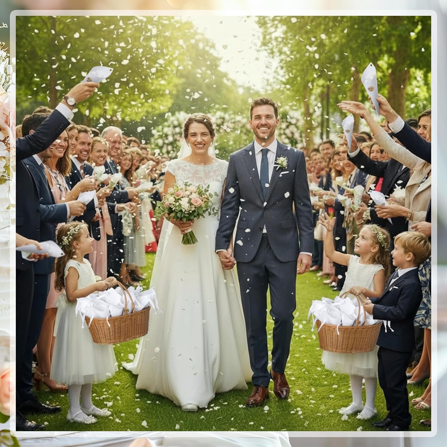 Features: Easy Assembly: The conical paper tubes come pre-cut with ribbon attachments, requiring no extra tools to set up. Simply fill them with petals, stick on the "Throw Me" stickers, and they're ready for guests. The process takes little time, making it easy to prepare even amid busy wedding or party planning. Safe for All Interactions: The paper petals are lightweight and smooth to the touch, avoiding irritation when tossed or handled. The bamboo basket features polished edges with no rough spots, safe for guests of all ages to carry or display. These gentle textures ensure comfortable use during celebrations. Specifications: Material: paper, bamboo, satin Color: white and brown Size: Bamboo basket: about 10.63 x 9.06 x 10.63 inches/ 27 x 23 x 27 cm(LxWxH) Double-sided tape: about 629.92 inches x 0.31 inches/ 16 M x 8 mm(LxW) Paper cone: about 6.69 x 6.69 inches/ 17 x 17 cm Round stickers: about 0.98 inch/ 2.5 cm(D), White ribbon: about 9.84 x 0.39 inches/ 25 x 1 cm(LxW), Crepe paper petals: about 0.98 inch/ 2.5 cm(D) Package includes: 1 x Bamboo basket 1 x Double-sided tape 60 x Paper cones 60 x Round stickers, 60 x White ribbons, 5000 x Crepe paper petals Notes: Manual measurement, please allow slight errors on size. The color may exist a slight difference due to different screen displays