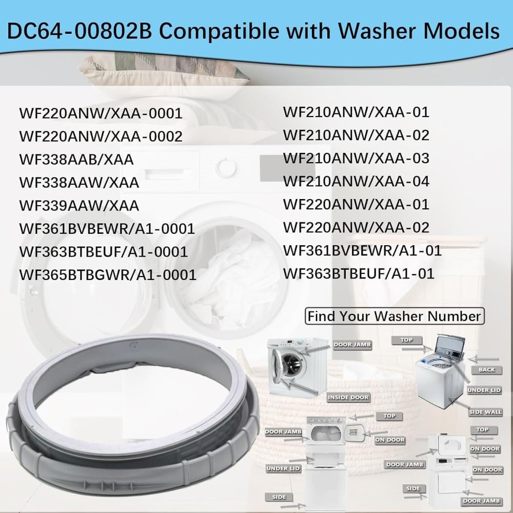 DC64-0080802B Washer Door Boot Seal Gasket (also known as door bellow or diaphragm) This DC64-0080802B washer door boot seal gasket (also known as door bellow or diaphragm) is a replacement part that forms a watertight seal between the door and tub in front-load washing machines. Compatible Models WF220ANW/XAA WF338AAB/XAA WF339AAW/XAA WF361BVBEWR/A1 and other Samsung front-load washer models that reference this part number or its cross-referenced equivalents in their official parts list Replaces Part Numbers DC64-0080802B (main number) AP4342944 PS4210921 2071562 This gasket helps maintain proper sealing to support normal washer operation. Made from rubber material designed for flexibility and resistance to typical washer conditions. Verification Steps for Compatibility To ensure this replacement part matches your appliance: Locate the model and serial number label on your Samsung front-load washer (usually found inside the door opening, on the door frame, or on the back panel of the machine). Use the official Samsung parts lookup tool available on their website or contact Samsung support with your model number. Search for the door boot seal gasket (also called bellow or diaphragm) and verify if DC64-0080802B (or one of the replaced numbers: AP4342944, PS4210921, 2071562) is listed for your exact model. This step is critical to avoid mismatches, returns, or installation problems. Always cross-reference with your washer’s service manual or parts diagram for confirmation. Package Details The package includes one washer door boot seal gasket (DC64-0080802B compatible) in standard protective packaging. The item is shipped in a compact form suitable for delivery and storage, with approximate dimensions of 14 inches in length, 8 inches in width, and 6 inches in height. No additional hardware, tools, clamps, screws, or printed installation instructions are included in the package. Installation Reference Replacement typically involves disconnecting the washer from power, removing the front panel, detaching the old gasket, cleaning the mounting area, and securing the new gasket with the existing clamps or bands. For detailed steps, refer to your washer’s service manual, official Samsung support resources, or model-specific online video guides. Professional installation is recommended if you are not experienced with appliance repairs. IMPORTANT NOTE: This is a generic replacement part manufactured to align with the specifications of the listed original part numbers. It is not an OEM product from Samsung but is compatible with the models and numbers shown. Double-check compatibility using official Samsung resources before purchase to ensure proper fit and function.