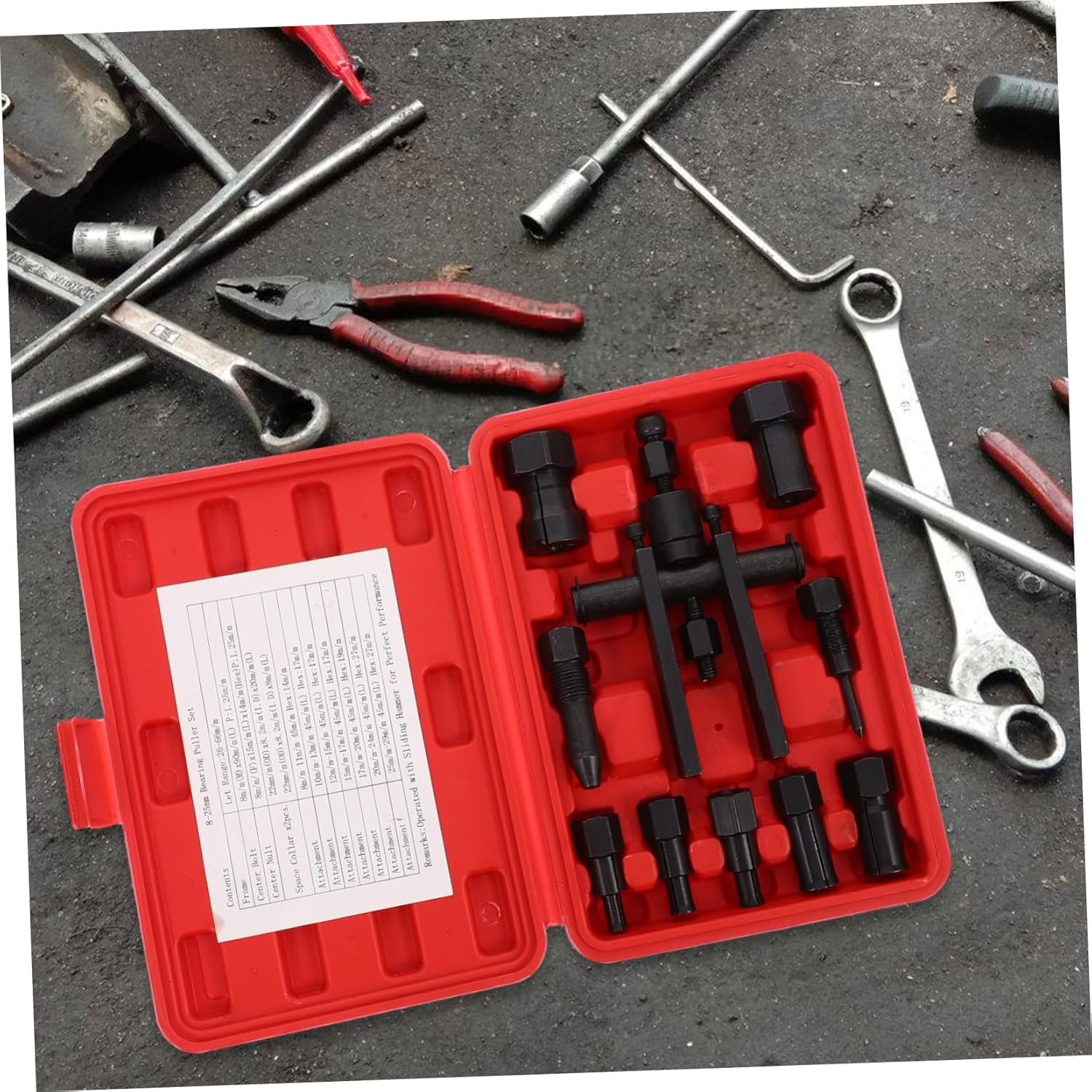 Package List 10 x bearing pullers 1 x plastic box Characteristics - Color: Red (box), black (puller) Two-Jaw Bearing Removal Puller. - Note: clamping range: 25-65mm Motorcycle Bearing Puller. - Size: 21.80X15.00X4.50 cm/8.57X5.89X1.77 inch Motorcycle Bearing Removal Puller. - Material: Plastic (box), alloy steel (puller) Motorcycle Bearing Removal Tool. - It can be well applied to your maintenance and disassembly work to provide you with more convenience Bearing Disassembly Puller. - It makes assembly very easy and , and will be a choice for your disassembly and repair tools Bearing Removing Puller. - It is made of high grade material, which is not easy to damage or break, safe and reliable Motorcycle Bearing Disassembly Tool. - craftsmanship, durable and practical, toughness, you can use it with confidence Bearing Disassembly Tool. - Easy to carry and store, convenient for you to use at any time. This is motorcycle bearing remover kit tool Practical Bearing Puller.Goods DescriptionMotorcycle Bearing Puller This is one of your choices.Motorcycle Two-Jaw Bearing Puller Are you looking for professional and two-jaw bearing puller? Are you looking for a sturdy, trustworthy tool that can perform multiple tasks at the same time? If so, please look no further! Our professional inner bearing puller will surely meet your needs