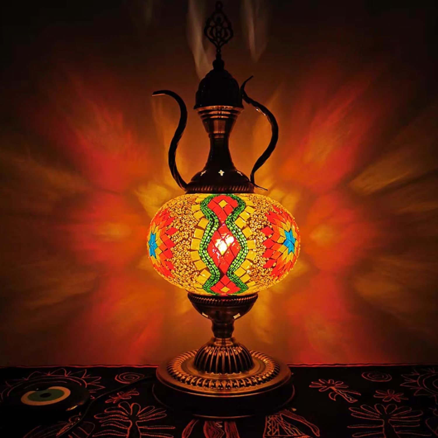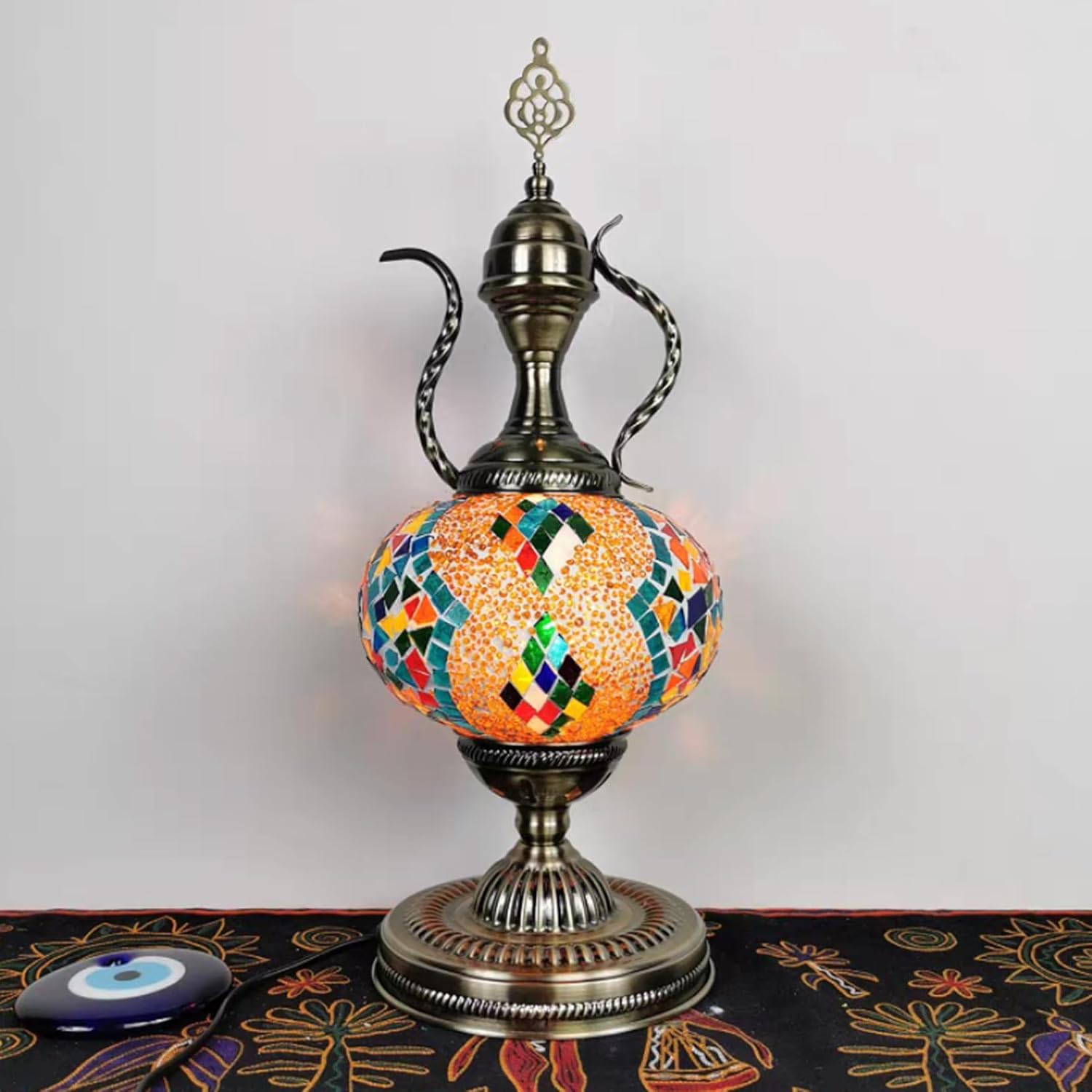 ★ Description: Turkish Mosaic Moroccan Bohemian Teapot Lamp Stained Glass Table Lamp★ Shade Material: Stained Glass + mosaic process★ Lamp body Material: Iron, surface electroplated bronze;★ Size: Height -18 inches (45cm), Base Width - 6 inches (16cm), Lampshade diameter - 7 inches (18cm). ★ Light source requirement: E12/E14×1. ★ Applicable scene: can be used as a gift to friends, home bedroom, living room, dining room decoration, industrial decoration for villa living room, characteristics of the restaurant, cafe, lodging, clothing shops, speciality hotels, bar and large clubs;