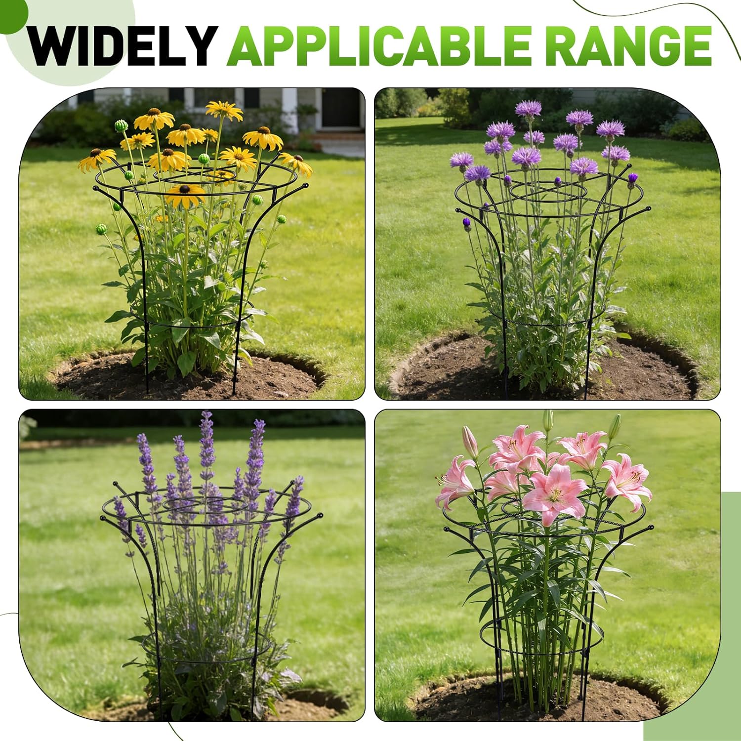 This peony support cage is designed to help keep tall flowers and top-heavy blooms more upright as they grow The wide top ring helps guide stems into a fuller bouquet shape while providing support around the plant Insert the legs into the soil to help keep the frame stable through the growing season Detachable design makes it easier to assemble and store when not in use Recommended to check sizing and spacing in your garden bed before purchase Specifications: Color: Black Material: Iron wire with black powder coating Overall Size: 32.2" H x 19.2" D