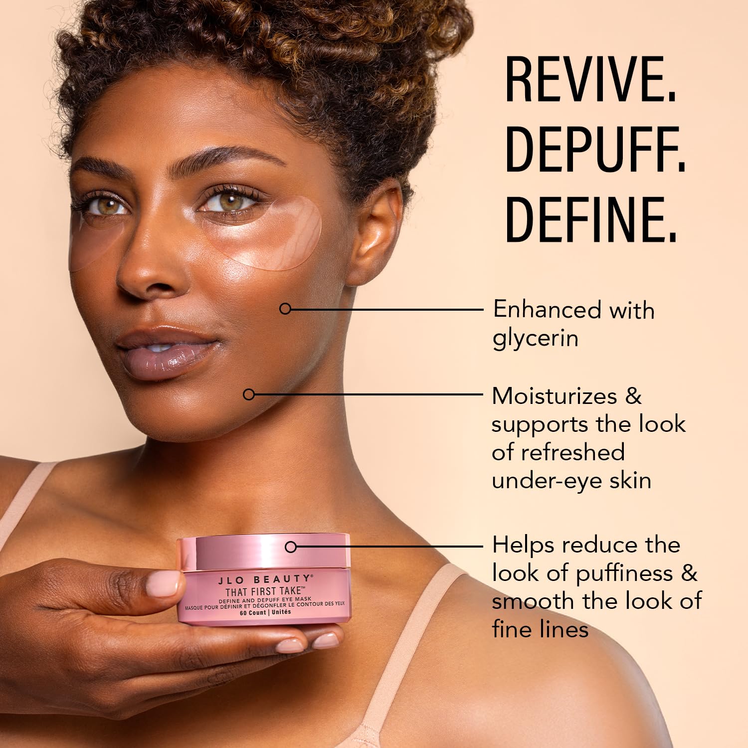 Revive the look of tired eyes with That First Take Define & Depuff Eye Mask. These high-performance hydrogel eye masks are saturated with an advanced solution of key ingredients, thoughtfully formulated for the delicate under-eye area. Infused with Advanced Tetrapeptides a Hyaluronic Acid Complex, and a Revitalizing Complex of botanicals, this precisely dosed formula helps reduce the appearance of puffiness to support a brighter, more luminous look under the eyes. That First Take helps the under-eye appearance to help restore a refreshed, youthful look. Perfect for pre-event prep or on-the-go rejuvenation, apply for 10–15 minutes for renewed, camera-ready eyes