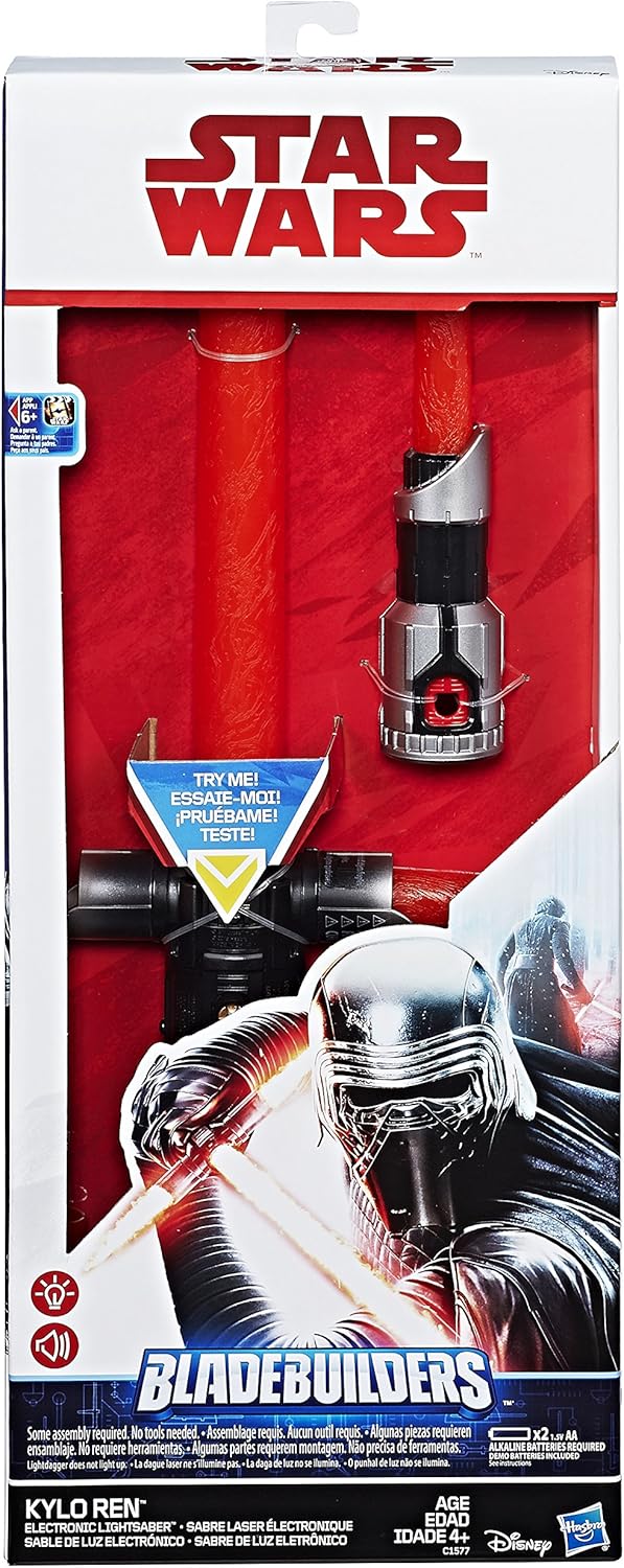 Launch into action and adventure in the world of Star Wars! Discover the exciting stories of good versus evil in a universe of heroes, villains, and aliens. Imagine Kylo Ren slashing into a fiery battle with this Kylo Ren Electronic Lightsaber! Skillfully wield the Kylo Ren Electronic Lightsaber while movie-real light and sound effects are activated, letting kids imagine that they are charging into an exciting lightsaber duel! The Kylo Ren Electronic Lightsaber also comes included with a connector that allows for a customizable Bladebuilders lightsaber experience! Re-live all of the epic excitement from Star Wars: The Last Jedi with this the Kylo Ren Electronic Lightsaber from Bladebuilders and other exciting role-play toys from Star Wars! (Sold separately). May the Force be with you! Additional items sold separately. Hasbro and all related characters are trademarks of Hasbro. Star Wars products are produced by Hasbro under license from Lucasfilm Ltd.